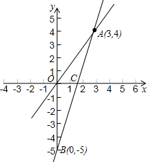 如图,正比例函数与一次函数交于点A(3,4),且一次函数与x轴交于点C,与y轴交于点B,