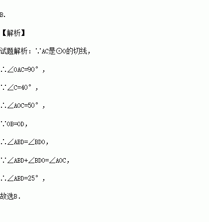 如图,AB是⊙O的直径,AC是⊙O的切线,连接OC交⊙O于点D,连接BD,∠C=40°.则∠ABD的度数是( )
