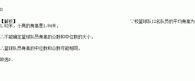 小亮所在的校篮球队12名队员的平均身高为1.82米,小亮的身高( )
