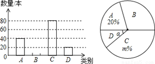 (1)这次统计共抽取了 书籍,扇形统计图中的m= ,∠α的度数是