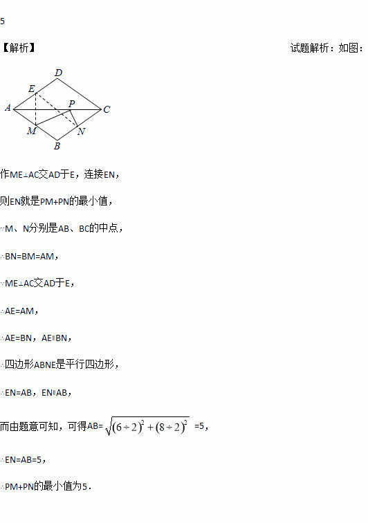 如图,菱形ABCD的两条对角线分别长6和8,点P是对角线AC上的一个动点,点M、N分别是边AB、BC的中点,则PM+PN的最小值是________.