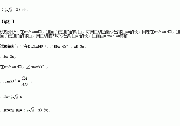 某路口设立了交通路况显示牌(如图).已知立杆AB高度是3m,从侧面D点测得显示牌顶端C点和底端B点的仰角分别是60°和45°,求路况显示牌BC的长度.(结果保留根号)