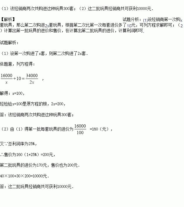 某玩具经销商用1.6万元购进了一批玩具,上市后一周全部售完.该经销商又用3.4万元购进第二批这种玩具,所购数量是第一批购进数量的2倍,但每套进价多了10元.