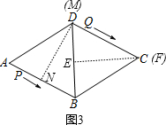 £¨3£©¸ù¾Ý¡÷BEFÓë¡÷AMNÏàËÆµÃµ½¡÷BEFΪֱ½ÇÈý½ÇÐΣ®ÓÉ¡÷ABDΪµÈ±ßÈý½ÇÐεáÏABD=60¡ã£¬¸ù¾ÝËٶȹ«Ê½µÃ¾¹ý3ÃëºóµãPÔ˶¯µÄ·³ÌΪ24cm¡¢µãQÔ˶¯µÄ·³ÌΪ3acm£¬ËùÒÔBE=DE=24cm£¬È»ºó·ÖÀàÌÖÂÛ£ºµ±µãQÔ˶¯µ½Fµã£¬ÇÒµãFÔÚNBÉÏ£¬Èçͼ1£¬ÔòNF=3a£¬BF=BN-NF=24-3a£¬ÓÉÓÚ¡÷BEFΪֱ½ÇÈý½ÇÐΣ¬¶ø¡ÏFBE=60¡ã£¬Ö»Äܵõ½¡ÏEFB=90¡ã£¬ËùÒÔ¡ÏFEB=30¡ã£¬¸ù¾Ýº¬30¶È½ÇµÄÖ±½ÇÈý½ÇÐÎÈý±ßµÄ¹ØÏµµÃ24-3a=$\frac{1}{2}$¡Á24£¬½âµÃa=4£»µ±µãQÔ˶¯µ½Fµã£¬ÇÒµãFÔÚBCÉÏ£¬Èçͼ2£¬ÔòNF=3a£¬BF=BN-NF=3a-24£¬ÓÉÓÚ¡÷BEFΪֱ½ÇÈý½ÇÐΣ¬¶ø¡ÏFBE=60¡ã£¬Èô¡ÏEFB=90¡ã£¬Ôò¡ÏFEB=30¡ã£¬¸ù¾Ýº¬30¶È½ÇµÄÖ±½ÇÈý½ÇÐÎÈý±ßµÄ¹ØÏµµÃ3a-24=$\frac{1}{2}$¡Á24£¬½âµÃa=12£»Èô¡ÏBEF=90¡ã£¬Ò׵ôËʱµãFÔÚµãC´¦£¬Èçͼ3£¬Ôò3a=24+48£¬½âµÃa=24£®