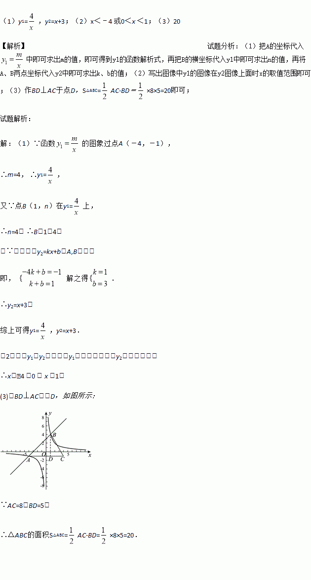 的图象与一次函数y2=kx+b的图象交于点A(-4,-1)和点B(1,n).