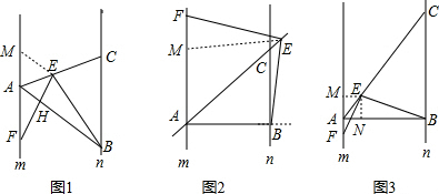 分析:(1)首先以E为圆心,以EA为半径画弧交直线m于点M,连接EM,进而得出△AEB≌△MEF,即可得出答案;