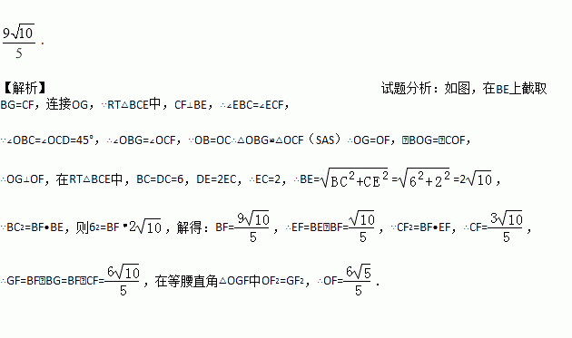 如图,正方形ABCD的边长为6,点O是对角线AC、BD的交点.点E在CD上,且DE=2CE,连接BE.过点C作CF⊥BE,垂足是F,连接OF,则OF的长为 .
