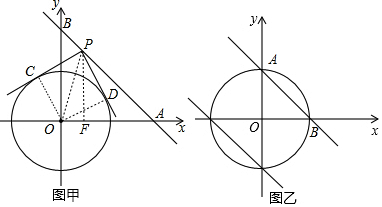 ·ÖÎö £¨1£©Á¬½ÓOC¡¢OD£¬Èçͼ¼×£¬¸ù¾ÝÇÐÏßµÄÐÔÖʵÃOC¡ÍPC£¬PD¡ÍPD£¬¼ÓÉÏ\PC¡ÍPD£¬Ôò¿ÉÅжÏËıßÐÎOCPDΪ¾ØÐΣ¬È»ºóÀûÓÃOC=OD¿ÉÅжÏËıßÐÎOCPDΪÕý·½ÐΣ»