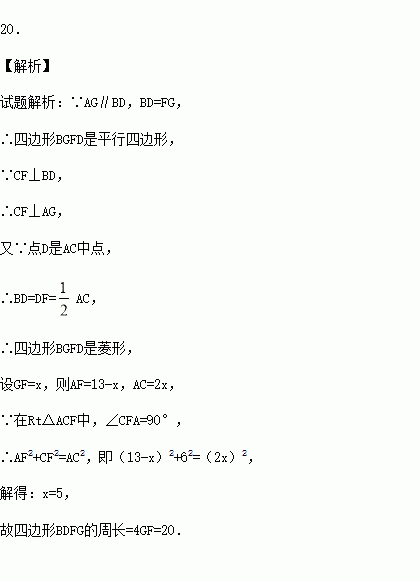 如图,在△ABC中,∠ABC=90°,BD为AC的中线,过点C作CE⊥BD于点E,过点A作BD的平行线,交CE的延长线于点F,在AF的延长线上截取FG=BD,连接BG、DF.若AG=13,CF=6,则四边形BDFG的周长为 .