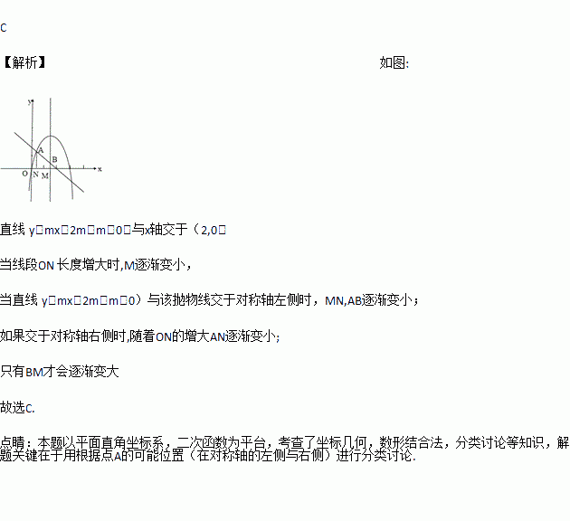 在平面直角坐标系中,O 为原点,抛物线y=-x2+3x 的对称轴l 交x 轴于点M,直线 y=mx-2m(m<0)与该抛物线x 轴上方的部分交于点A,与l 交于点B,过点A 作AN⊥x 轴,垂足为N,则下列线段中,长度随线段ON 长度的增大而增大的是( )