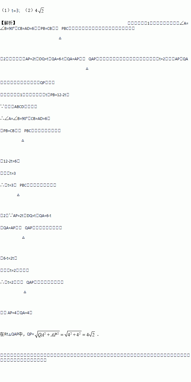 如图,在矩形ABCD中,AB=12cm,BC=6cm,点P沿AB边从点A开始向点B以2cm/秒的速度移动;点Q沿DA边从点D开始向点A以1cm/秒的速度移动,如果P、Q同时出发,用t(秒)表示移动的时间(0<t<6).