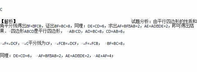 如图,在?ABCD中,AB=6,BC=8,∠C的平分线交AD于E,交BA的延长线于F,则AE+AF值等于( )