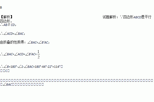 ABCD沿对角线AC折叠,使点B落在点B’处.若∠1=∠2=44°,则∠B为 ( )