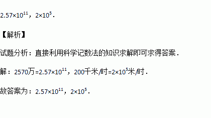 “天河一号”计算机的运算速度是2570万亿次/秒,用科学记数法表示为 次/秒.动车速度一般为200千米/时左右,用科学记数法表示为 米/时.