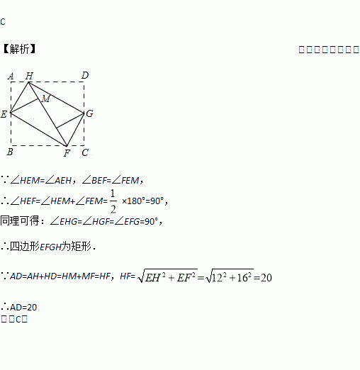 如图,小明同学在将一张矩形纸片ABCD的四个角向内折起时,发现恰好能拼成一个无缝隙无重叠的四边形EFGH。于是他测量出EH=12cm,EF=16cm,根据这两个数据他很快求出了边AD的长,则边AD的长是( )