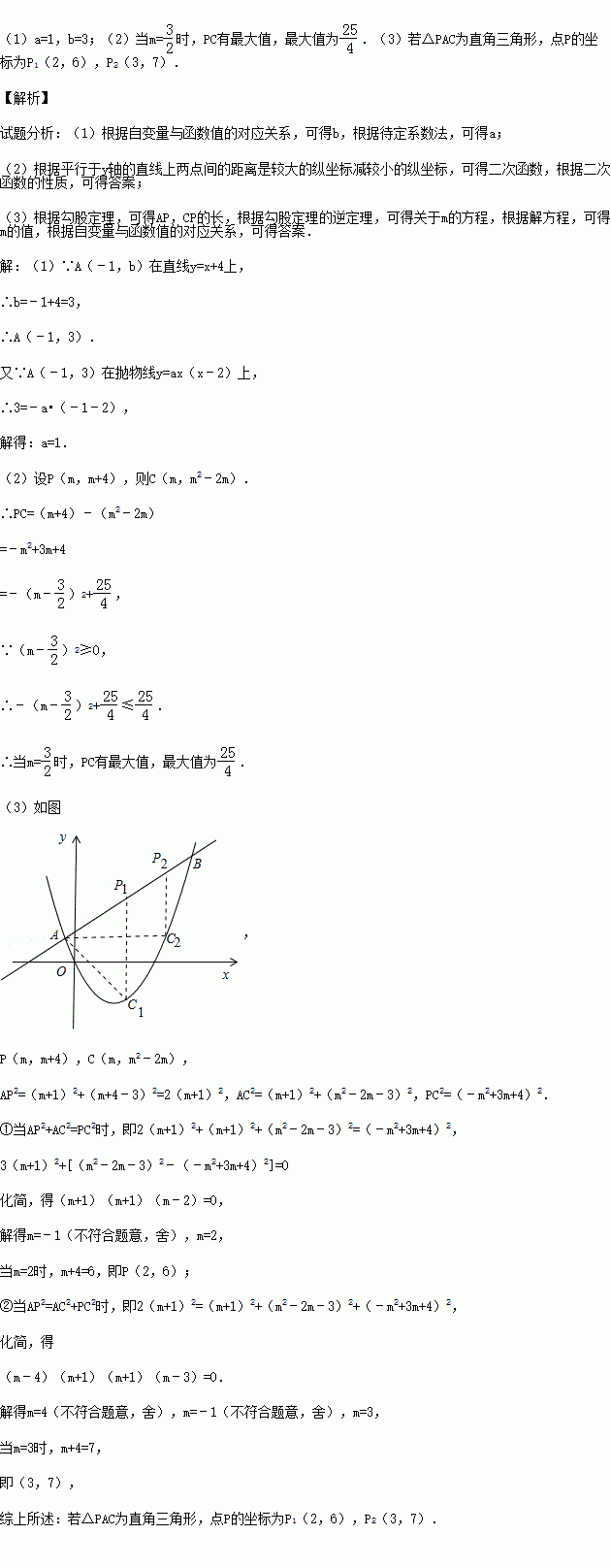 已知一次函数y=x+4的图象与二次函数y=ax(x﹣2)的图象相交于A(﹣1,b)和B,点P是线段AB上的动点(不与A、B重合),过点P作PC⊥x轴,与二次函数y=ax(x﹣2)的图象交于点C.