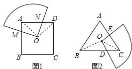 分析:(1)设扇形纸板的两边与正方形的边AB、AD分别交于点M、N,连结OA、OD,根据ASA定理得出△AMO≌△DNO,故可得出AM=DN,由此可得出结论;