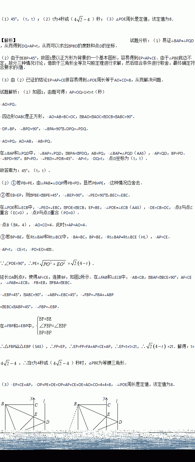 如图,正方形OABC的边OA,OC在坐标轴上,点B的坐标为(-4,4),点P从点A出发,以每秒1个单位长度的速度沿x轴向点O运动,点Q从点O同时出发,以相同的速度沿x轴的正方向运动,规定点P到达点O时,点Q也停止运动,连接BP,过P点作BP的垂线,与过点Q平行于y轴的直线l相较于点D,BD与y轴交于点E,连接PE,设P运动时间为t(s).