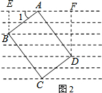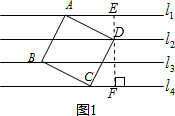 分析 (1)过D点作直线EF与平行线垂直,与l1交于点E,与l4交于点F.易证△ADE≌△DFC,得CF=2,DF=4.根据勾股定理可求CD2得正方形的面积;