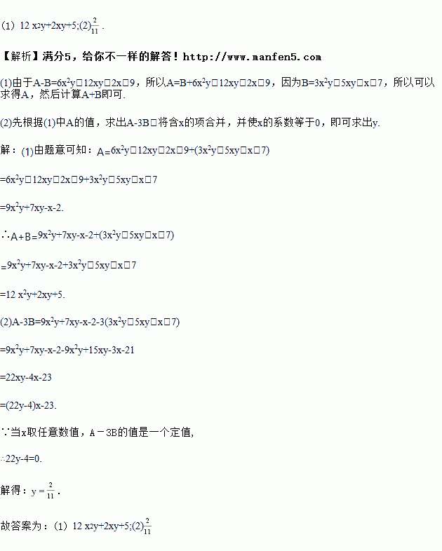 某同学做一道数学题,已知两个多项式A、B,B=3x2y-5xy+x+7,试求A+B,这位同学把A+B看成A-B,结果求出的答案为6x2y+12xy-2x-9.