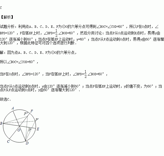 如图,点A、B、C、D、E、F为⊙O的六等分点,动点P从圆心O出发,沿OE弧EFFO的路线做匀速运动,设运动的时间为t,∠BPD的度数为y,则下列图象中表示y与t之间函数关系最恰当的是( )