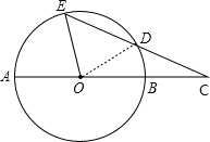 已知AB为⊙O的直径,弦ED与AB的延长线交于⊙O外一点C,且AB=2CD,∠C=25°,求∠AOE的度数.