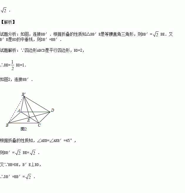 如图,?ABCD中,对角线AC与BD相交于点E,∠AEB=45°,BD=2,将△ABC沿AC所在直线翻折180°到其原来所在的同一平面内,若点B的落点记为B′,则DB′的长为 .