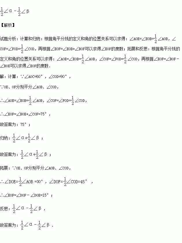 反思:通过上面的拓展猜一猜,当有公共顶点的两个角∠α、∠β(∠α>∠β)有一条边重合,且这两个角在公共边的同侧时,则这两个角的平分线所夹的角= .