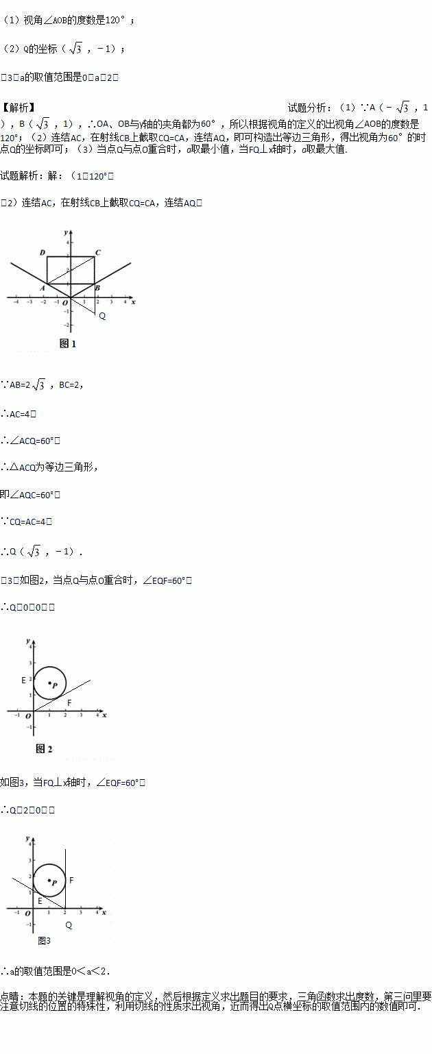 ),点Q在x轴上,且⊙P的视角∠EQF的度数大于60°,若Q(a,0),求a的取值范围.