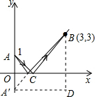 精英家教网如图,一束光线从y轴上点A(0,1)出发,经过x轴上点C反射后经过点B(3,3),则光线从A点到B点经过的路线长是