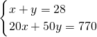 现有新版20元和50元人民币28张,总面额为770元.问其中20元币和50元币各有多少张?