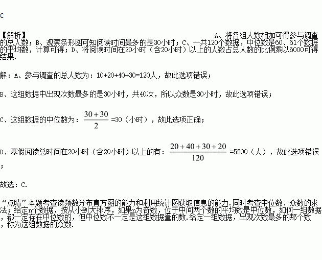 寒假结束了,开学后小明对本校七年级部分同学寒假阅读总时间(结果保留整10小时)进行了抽样调查,所得数据整理后制作成如图所示的频数分布直方图。观察这个频数分布直方图,给出如下结论,正确的是( )