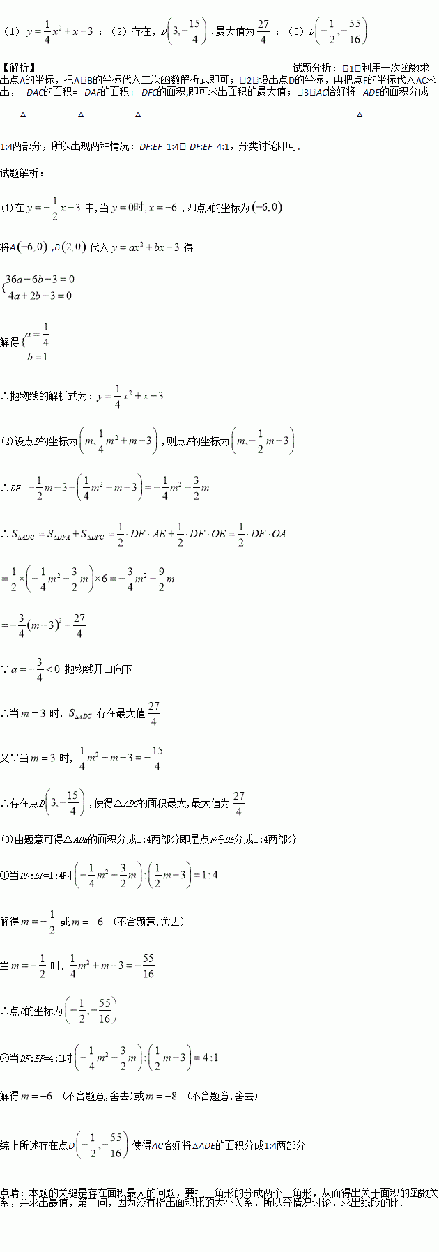 (3)过点D作DE⊥x轴于E,交AC于F,若AC恰好将△ADE的面积分成1:4两部分,请求出此时点D的坐标.