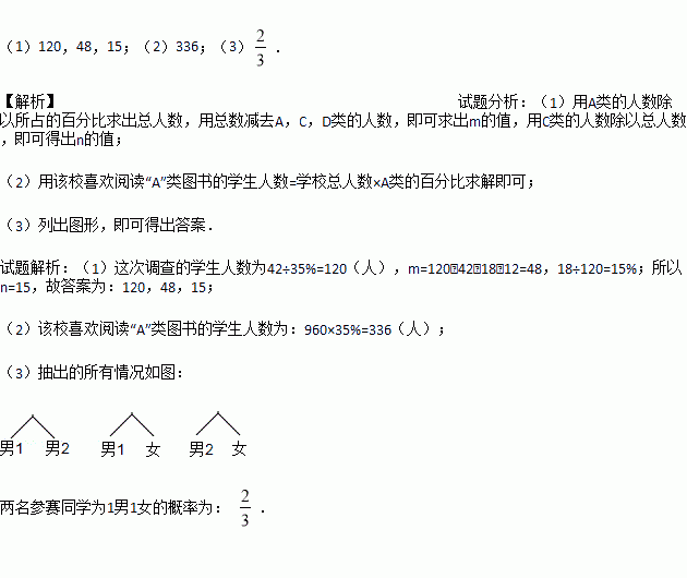 (2)已知该校共有960名学生,请估计该校喜欢阅读“A”类图书的学生约有多少人?