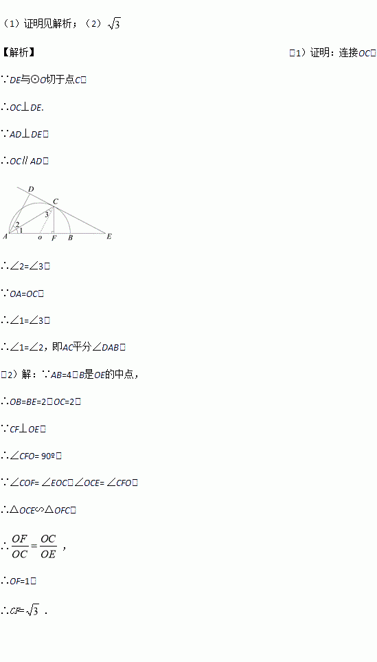 (2)若AB =4,B为OE的中点,CF⊥AB,垂足为点F,求CF的长.