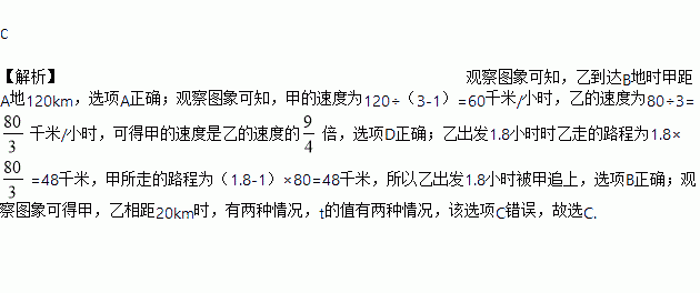 A. 乙到达B地时甲距A地120km. B. 乙出发1.8小时被甲追上.