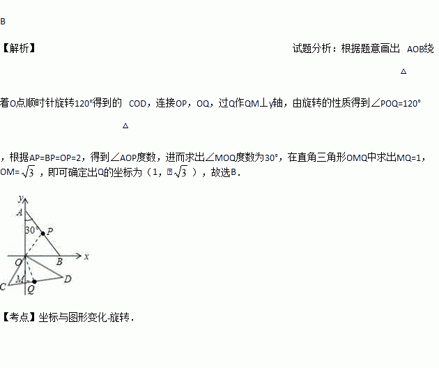如图,将斜边长为4的直角三角板放在直角坐标系xOy中,两条直角边分别与坐标轴重合,P为斜边的中点.现将此三角板绕点O顺时针旋转120°后点P的对应点的坐标是( )