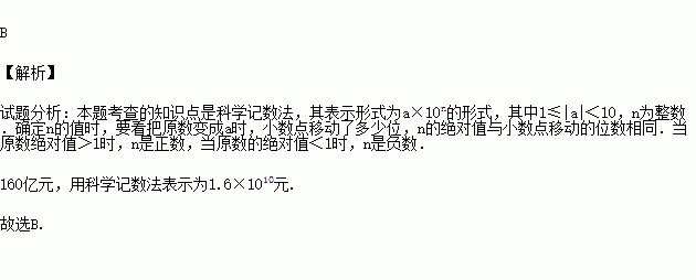 今年要实现大病保险全覆盖,中央财政安排城乡医疗救助补助资金160亿元,160亿元这一数据用科学记数法表示为( )