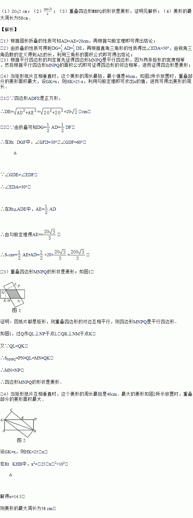 (2)如图(2),H,G分别为BC,AD的中点,A的对应点F在HG上,折痕为DE,求重叠部分的面积;