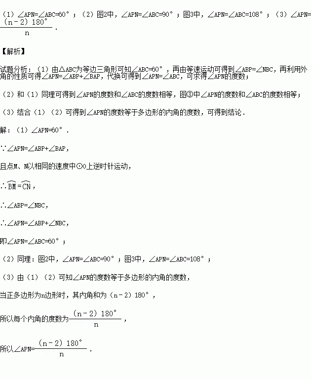 (2015秋•嵊泗县期中)如图①、②、③,正三角形ABC、正方形ABCD、正五边形ABCDE分别是⊙O的内接三角形、内接四边形、内接五边形,点M、N分别从点B、C开始,以相同的速度在⊙O上逆时针运动.