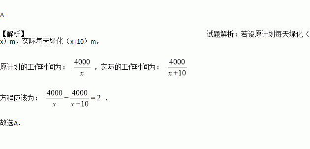 为了早日实现 “绿色无锡,花园之城”的目标,无锡对4000米长的城北河进行了绿化改造.为了尽快完成工期,施工队每天比原计划多绿化10米,结果提前2天完成.若原计划每天绿化x米,则所列方程正确的是( )