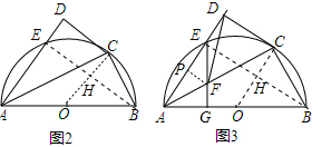 (2)如图2,连结OC、BE,它们相交于点H,先证明四边形CDEH为矩形得到CD=EH,DE=CH,设AE=3x,则AB=4x,利用勾股定理计算出BE=4x,利用垂径定理,由OH⊥BE得到EH=BH=$\frac{1}{2}$BE=2x,则CD=EH=2x,接着在Rt△OHB中利用勾股定理计算出OH=$\frac{3}{2}$x,则CH=OC-OH=x,所以DE=x,于是可判断DC=2DE;