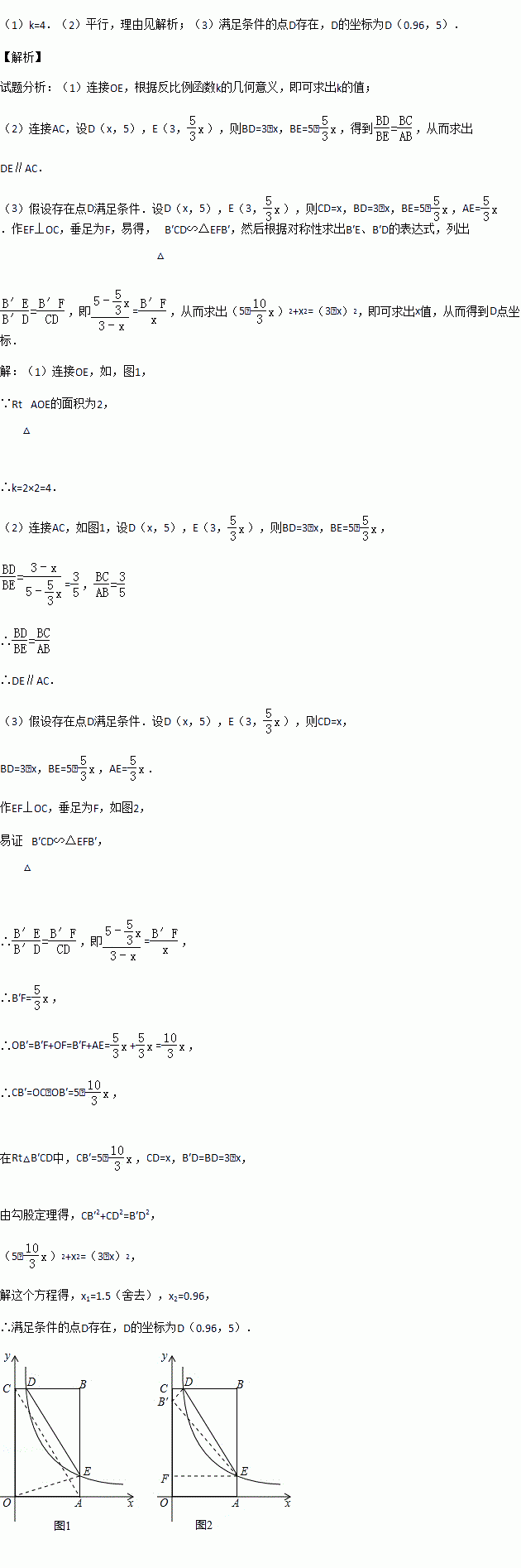 如图,在矩形OABC中,OA=3,OC=5,分别以OA、OC所在直线为x轴、y轴,建立平面直角坐标系,D是边CB上的一个动点(不与C、B重合),反比例函数y=