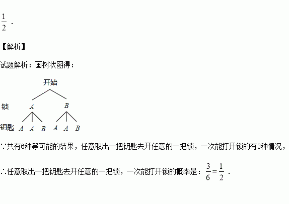 有两把不同的锁和三把钥匙,其中两把钥匙能打开同一把锁,第三把钥匙能打开另一把锁,任意取出一把钥匙去开任意一把锁,一次能打开锁的概率是______.