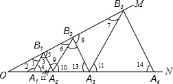 如图,已知:∠MON=30o,点A1、A2、A3 在射线ON上,点B1、B2、B3…..在射线OM上,△A1B1A2. △A2B2A3、△A3B3A4……均为等边三角形,若OA1=l,则△A6B6A7 的边长为【 】