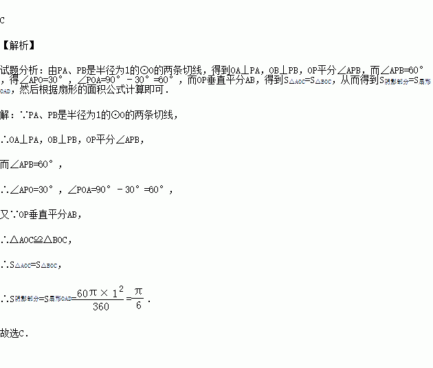(2015秋•鄂尔多斯校级月考)如图,PA、PB是半径为1的⊙O的两条切线,点A、B分别为切点,∠APB=60°,OP与弦AB交于点C,与⊙O交于点D.则图中阴影部分的面积是( )