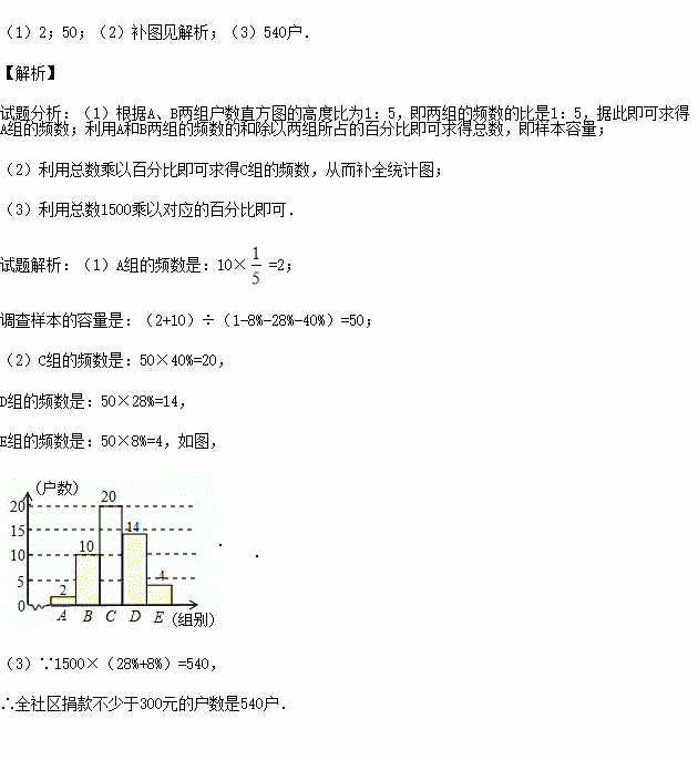 在信息快速发展的社会,“信息消费”已成为人们生活的重要部分.我市区机抽取了部分家庭,调查每月用于信息消费的金额,数据整理成如图所示的不完整统计图.已知A、B两组户数直方图的高度比为1:5,请结合图中相关数据回答下列问题: