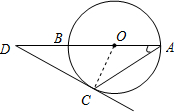 分析 首先连接OC,由CD是⊙O的切线,可得OC⊥CD,又由OA=OC,得到∠OCA=∠A=25°,即可求得∠DOC的度数,然后由两锐角互余即可求得答案.