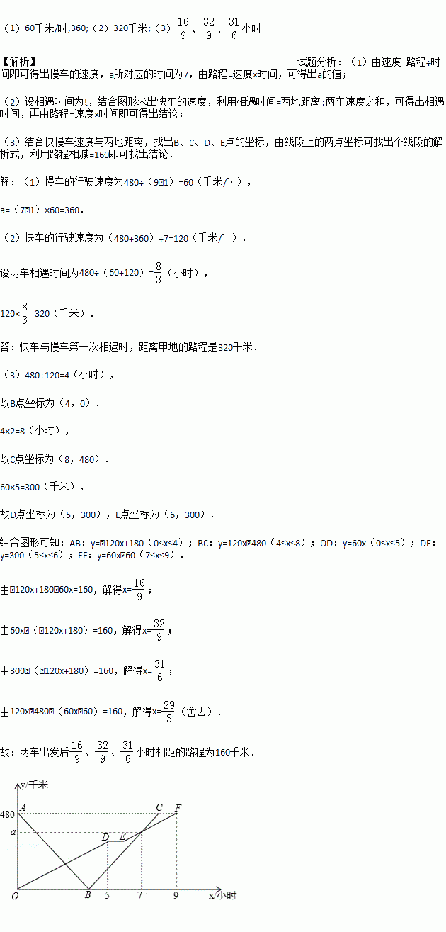 (本题满分12分)快、慢两车分别从相距480千米路程的甲、乙两地同时出发,匀速行驶,先相向而行,途中慢车因故停留1小时,然后以原速继续向甲地行驶,到达甲地后停止行驶;快车到达乙地后,立即按原路原速返回甲地(快车掉头的时间忽略不计),快、慢两车距乙地的路程