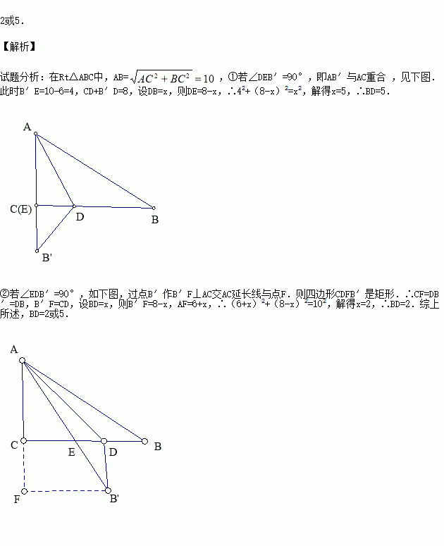 如图,Rt△ABC纸片中,∠C=90°,AC=6,BC=8,点D在边BC 上,以AD为折痕将△ABD折叠得到△AB′D,AB′与边BC交于点E.若△DEB′为直角三角形,则BD的长是_______.